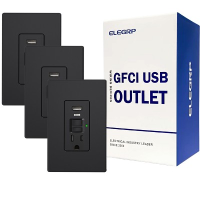 ELEGRP GFCI Outlet & USB Charger 24W combo Receptacle, Type A & C, 15A Tamper Resistant Self-Test,w/Screwless Wall Plate, UL & CUL Listed, Black,3 PC