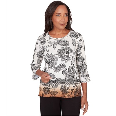 Alfred Dunner Womens Floral Linework Side Tie Ruched Top, Neutral Multi, Size M