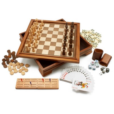 GSE Deluxe 7-in-1 Board Game Set - Chess, Checkers, Backgammon, Dominoes, Cribbage Board, Playing Card & Poker Dice Game Combo Set