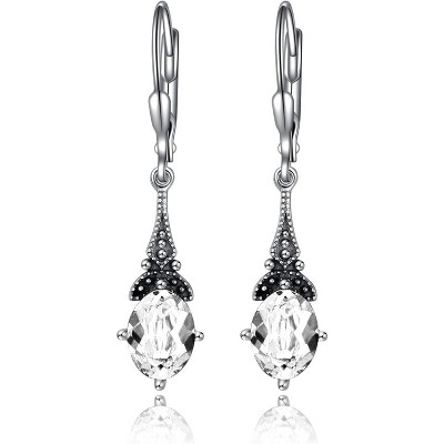 Vintage Sterling Silver Drop Dangle Earrings with Oval Crystal, Retro Leverback for Women, Anniversary Gift