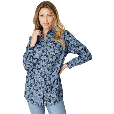 Roaman's Plus Size Kate Long Sleeve Easy Cotton-Blend Button-Front Shirt 38 W, Navy Lavish Paisley