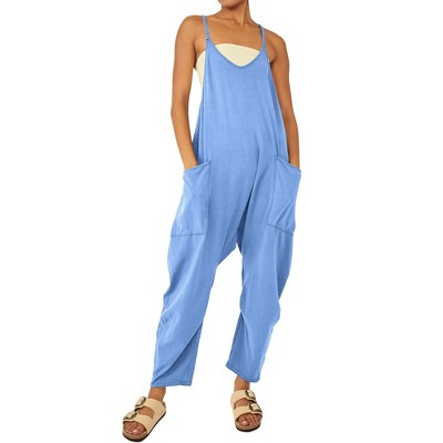 Nlife Women's Loose Casual V Neck Sleeveless Jumpsuits Spaghetti Straps Harem Long Pants with Pockets