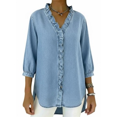 Coolmee Women's Casual Ruffle Denim Blouse V Neck 3/4 Sleeve Jean Tunic Tops for Daily Wear Dark Blue M