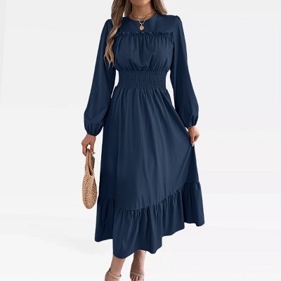 Coolmee Women Spring Fall Maxi Dress Long Sleeve V Neck Casual Flowy Pleated Ruffle Long Dress with Pockets