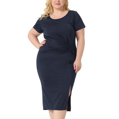 Agnes Orinda Women's Plus Size Crew Neck Side Split Tie Knot Front Short Sleeve Casual Midi Bodycon Dresses