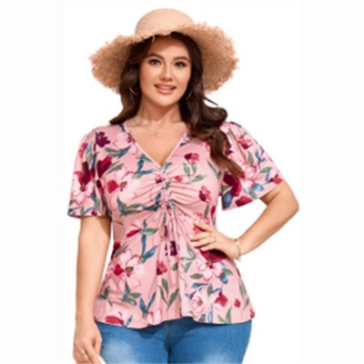 Clearlove Women's Plus Size Shirts V Neck Casual Tunic Tops Short Sleeve Floral Swing Blouse
