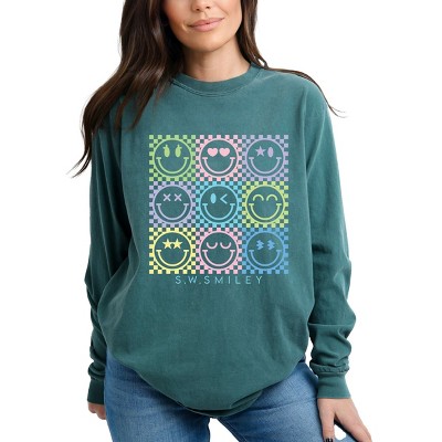 S.W.Smiley Checkered Neon - Women's Garment Dyed Long Sleeve Graphic T-Shirt