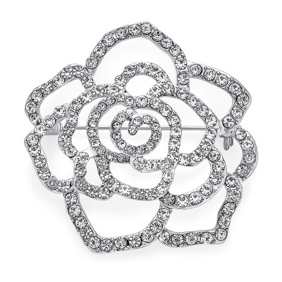 Bling Jewelry Large Fashion Statement Rose Flower Brooch Pin with Sparkling Crystals Silver Tone