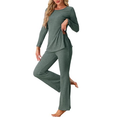 cheibear Women's Ribbed Knit Long Sleeves Top and Pants Two Piece Winter Pajama Sets