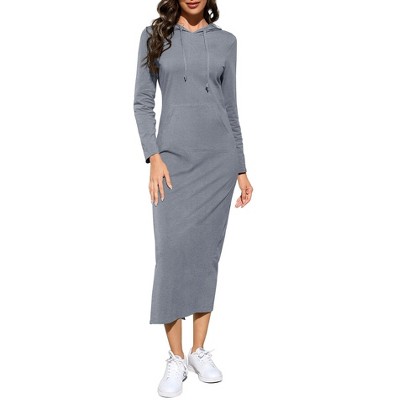 Women's Long Sleeve Hooded Maxi Dress - Casual Pullover with Kangaroo Pocket & Side Slit