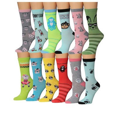 Tipi Toe Women's 12 Pairs Lightweight Colorful Owls Rabbit Monkey Animal Fun Patterned Crew Socks