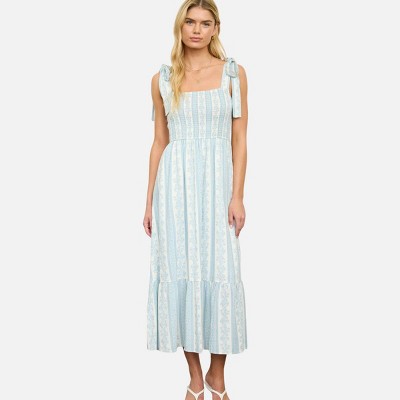 August Sky Tie Shoulder Striped Floral Midi Dress