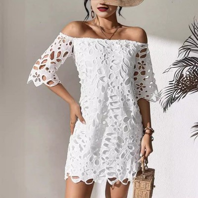 Women's Summer Off Shoulder Dresses Lace Short Sleeve Summer Vintage Elegant Mini Dress,White,XX Large