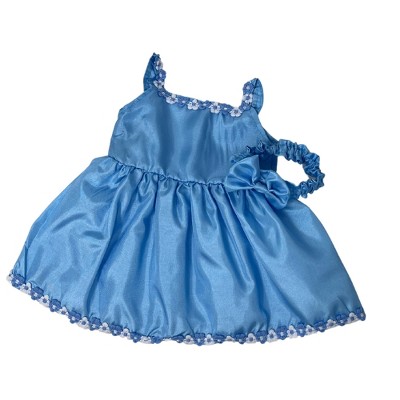 Sweet Blossom Blue Silk Dress with Floral Trim & Headband – Fits 15–16 Inch Baby Dolls