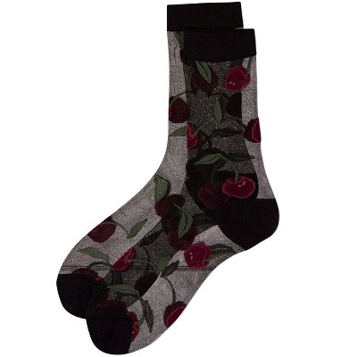 Memoi Women's Silky-Sheer Cherry-Themed Fashion Crew Sock Black 9-11
