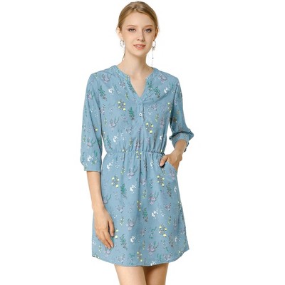 Allegra K Women's Button Front Floral Print Split Neck 3/4 Sleeves Mini Dresses