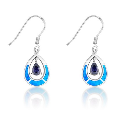 Opalata Sterling Silver Blue Inlay Opal Open Oval w/Blue Teardrop CZ Earrings - Blue