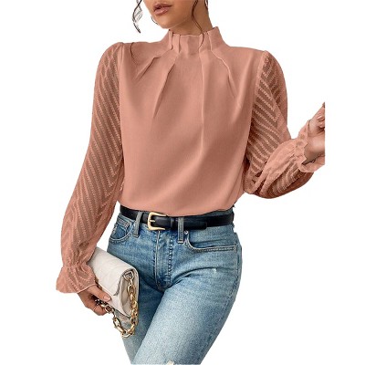 Womens Ruffle Cuff Mesh Sleeve Blouse Mock Neck Shirts with Keyhole Back Elegant Formal Tops Wear To Work Office Business Shirts