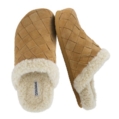 CUSHIONAIRE Cliché Genuine Suede Woven Mule Slippers for Women Indoor and Outdoor - Slip On Faux Fur Lining Women Footwear for Comfort