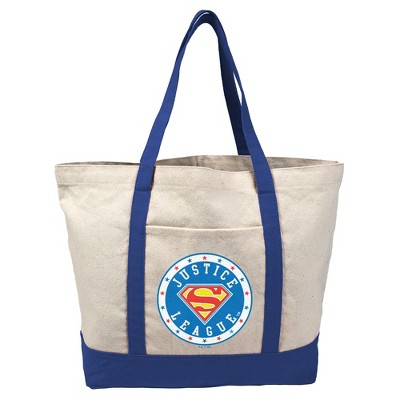 Justice League Superman Athletic Logo Canvas Tote Bag With External Pocket, Reusable Shoulder Bag for Shopping, School, Beach, Royal