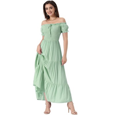 Allegra K Women's Round Neck Puff Sleeves Smocked Tiered Ruffle Maxi Dresses