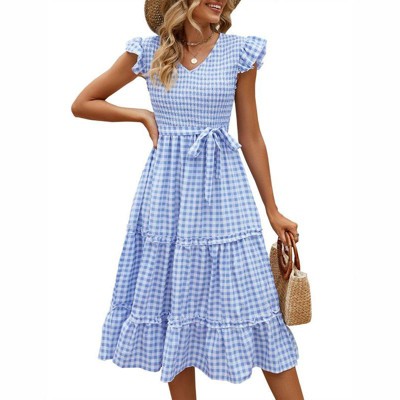Coolmee Women's Summer Boho Dresses Casual V Neck Ruffle Sleeve Sundress Flowy Tiered Beach Vacation Maxi Dress with Belt