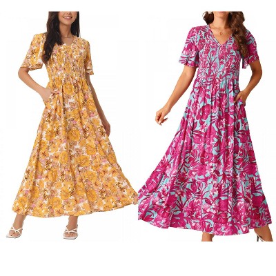 Women's Summer Boho Floral Print Dress Vintage Square Neck Ruffle Swing Flowy Beach Long Maxi Dress