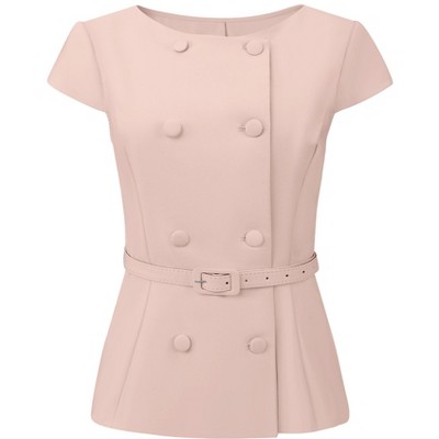 INSPIRE CHIC Women's Double Breasted Button Cap Sleeve Boat Neck Business Peplum Belted Blouses