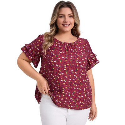 Women's Plus Size Floral-Print Crew Neck Double Layer Ruffle Short Sleeve Casual Blouses - GRACE & GRANDEUR