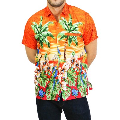 LA LEELA Mens Hawaiian Shirts Short Sleeve Button Down Shirt Men's Tropical Casual Holiday Party Caribbean Shirts for Men XS Long Tailed Macaw Orange