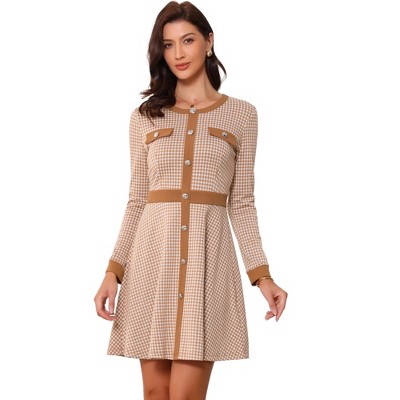 INSPIRE CHIC Women's Houndstooth Plaid Contrast Color Crew Neck Button Front Elegant A-Line Dress