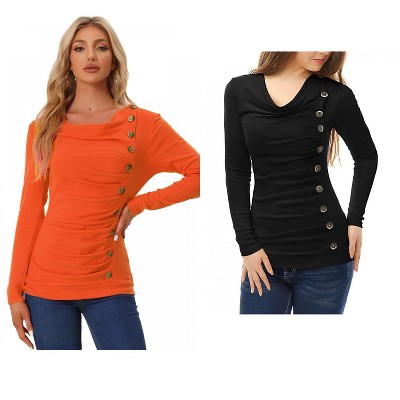 Allegra K Women's Cowl Neck Long Sleeves Buttons Decor Ruched Top 2 Pcs