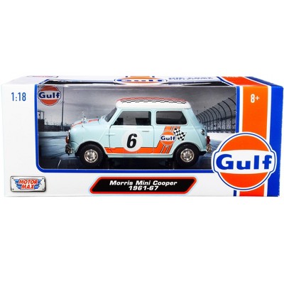 1961-1967 Morris Mini Cooper RHD #6 "Gulf Oil" Light Blue with Orange Stripes and Checkered Top 1/18 Diecast Car by Motormax