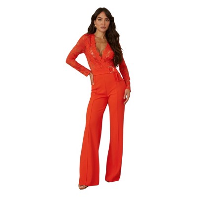 Slickblue Women’s Lace Mesh Jumpsuit, Crochet Detail, D-Ring Belt, Flared Leg, Night Out Style, Multiple Color Options, S-L