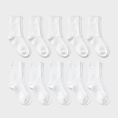 Girls' 10pk Casual Crew Lettuce Edge Socks - Cat & Jack™ Bright White