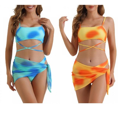 INSPIRE CHIC Women's Adjustable Spaghetti Straps Strappy Triangle Bottoms with Mesh Skirt Bathing Bikini Suit 2 Sets