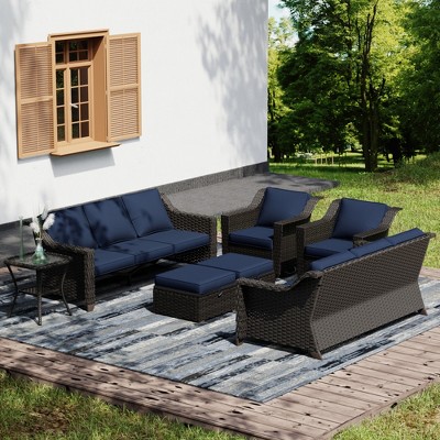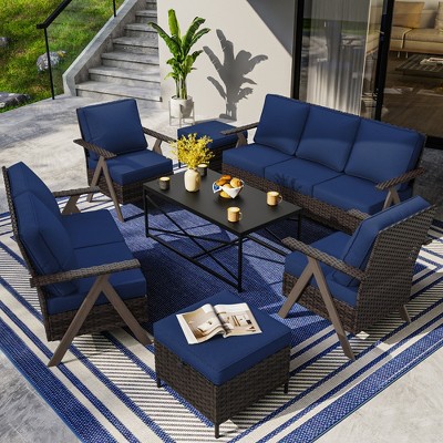 UPTIOT Premium Outdoor Seating Set: 7-Piece Modular Sofa with Double Chaise, Swivel Chairs & Tempered Glass Table for Luxurious Comfort,Blue