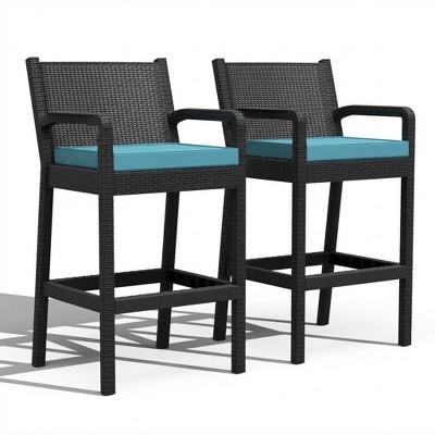 Set of 2 Outdoor Bar Stools with Armrests and Cushions, Black Wicker Patio Bar Height Chairs, Comfortable Seating for Balcony, Garden, Pool, Deck