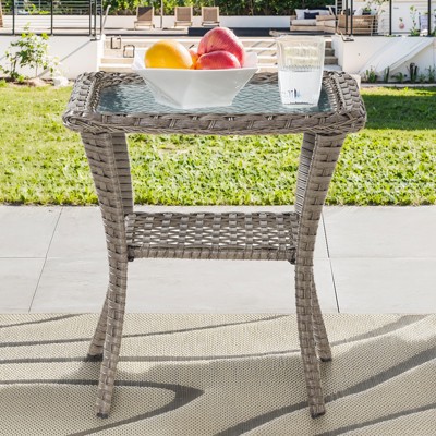 MOEPISY Rattan Side Table, with Storage Shelf, Aluminum Frame Square, Coffee Table with Tempered Glass Top