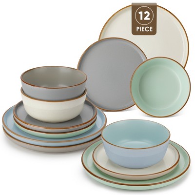 vancasso 12-Piece Mix Color Sesame Stoneware Dinnerware Set for 4 - Two-Tone Matte & Glossy Glaze with Curved Raised Rim, Includes Plates & Bowls
