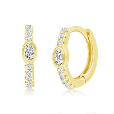 Bella Silver Sterling Silver 11MM Center Oval CZ Huggie Hoop Earrings - Gold Plated - Gold