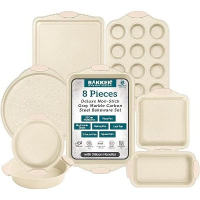 BAKKEN Deluxe 8-Piece Carbon Steel Bakeware Set - Nonstick White Marble Coating, Silicone Handles - Professional Quality Kitchen Oven Baking Pans