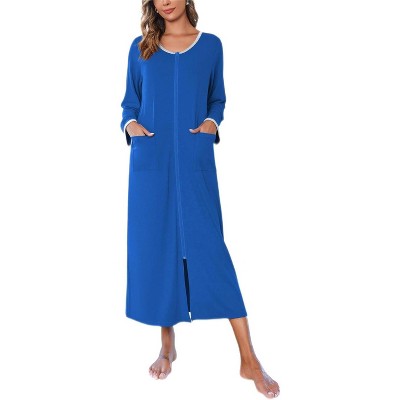 Ekouaer Women Long House Coat Zipper Front Robes Full Length Nightgowns with Pockets Striped Loungewear