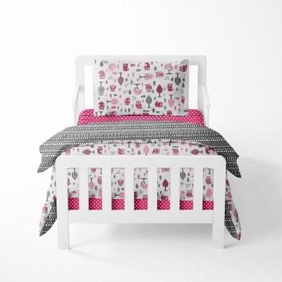 Bacati - Owls in the Woods Pink Fuschia Gray 4 pc Toddler Bedding Set