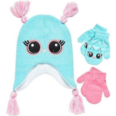Girls Critter Owl Winter Hat and 2 Pair Gloves or Mittens (Toddler/Little Girls)