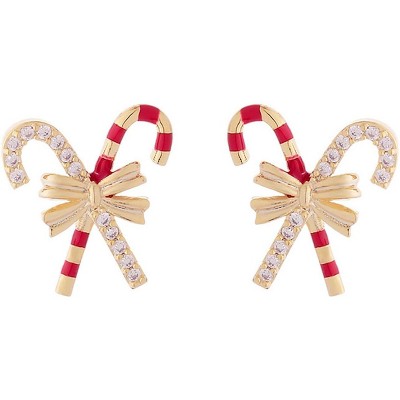 Gold Plated Candy Cane Stud Earrings | Sparkling Crystal/CZ & Enamel Red Green Design