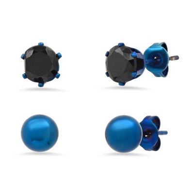 Steeltime Men's blue ip stainless steel simulated black diamonds stud earrings 2pc set