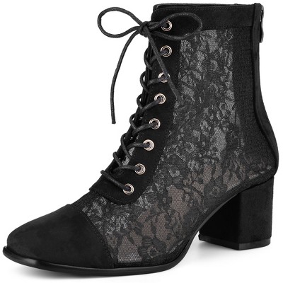 Perphy Women's Square Toe Lace Up Flowers Lace Block Heels Ankle Booties