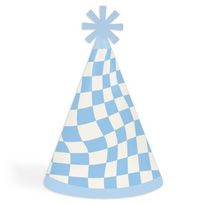 Big Dot of Happiness Blue Checkered Party - Cone Happy Birthday Party Hats for Kids and Adults - Set of 8 (Standard Size)
