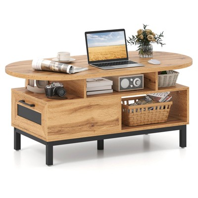 Costway 47” Oval Top Coffee Table with 4 Open Compartments & Drawer, 5 support legs Brown/Natural